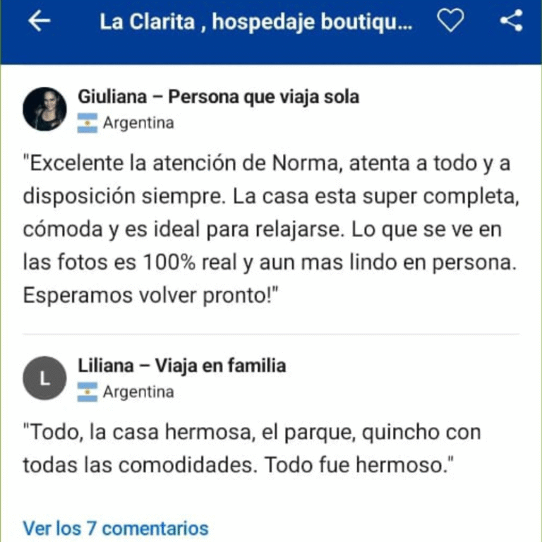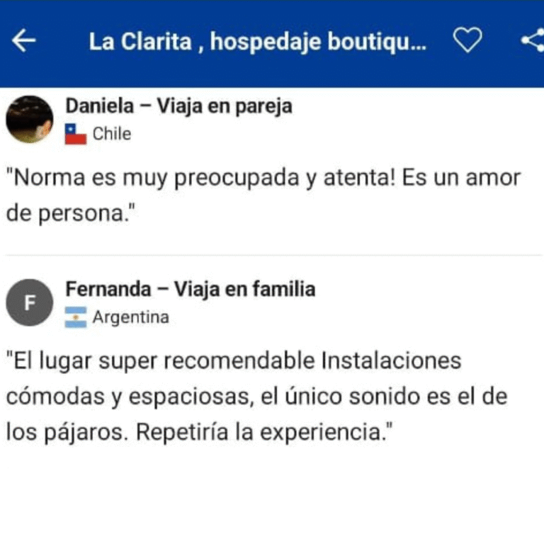 "El lugar super recomendable. Instalaciones cómodas y espaciosas, el único sonido es el de los pájaros. Repetiría la experiencia."